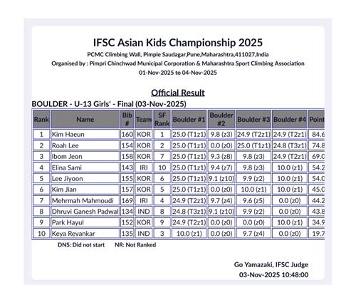 ⚡️الینا سامی نوجوان ۱۲ ساله اصفهانی در رشته سنگنوردی در ماده بولدرینگ در مسابقات آسیایی سنگنوردی هند موفق به کسب رتبه ارزشمند چهارم شد.